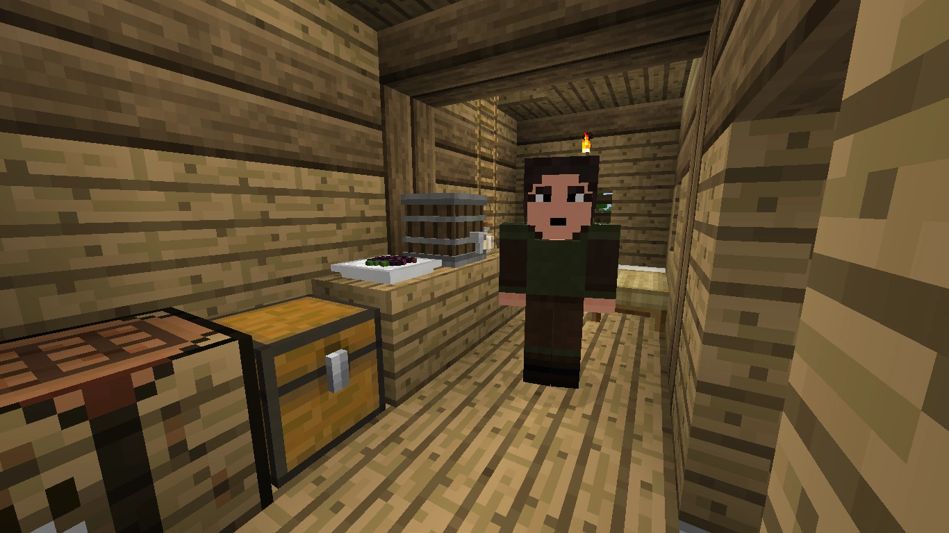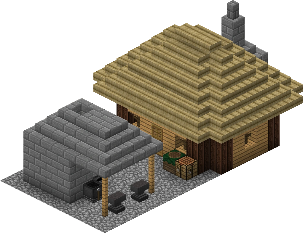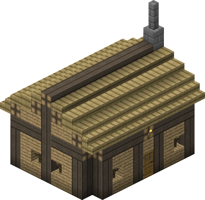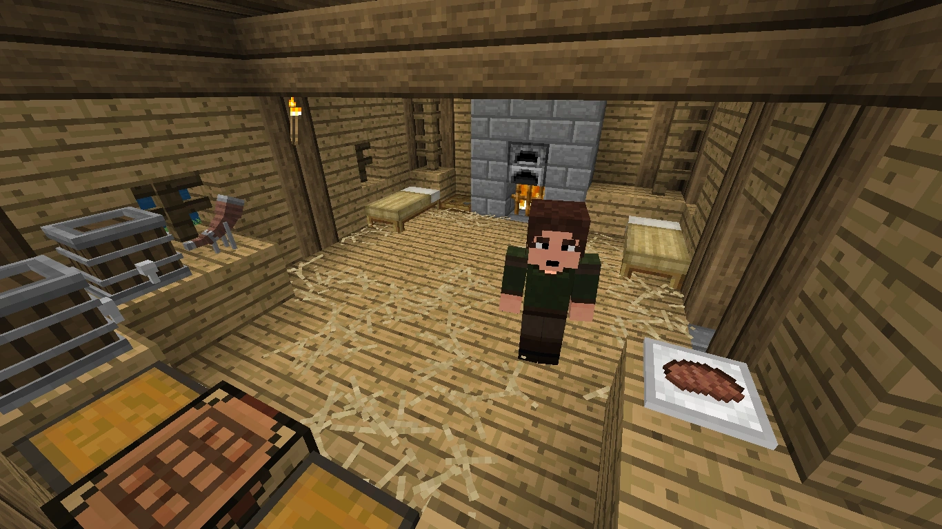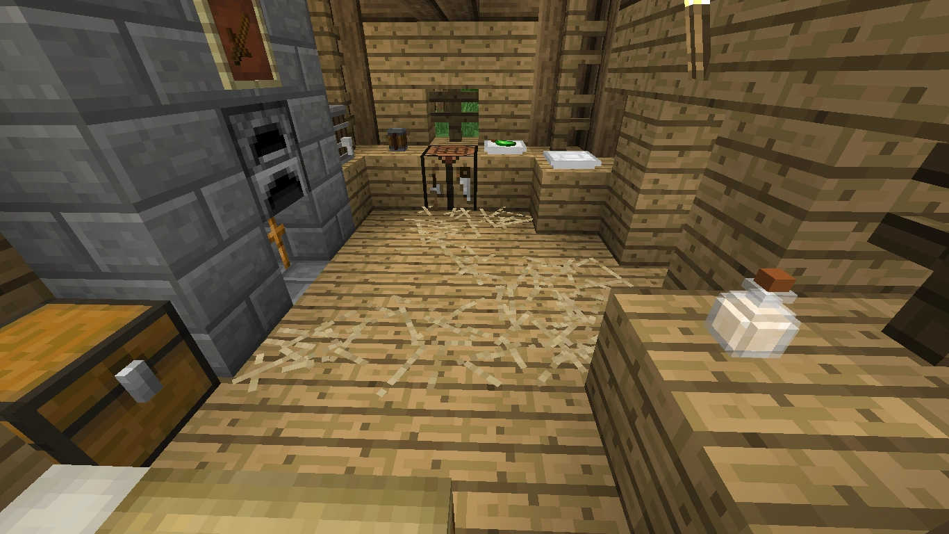 The wooden hut with the thatched roof holds a single room where the smith lives, when he's working. It is equipped similar to the normal houses with a straw bed, a vanilla crafting table, some tables with food and drink, a filled barrel, one chest with common items, and a fireplace including a furnace. The rooms seems to be rather small, but sufficient for a single person.