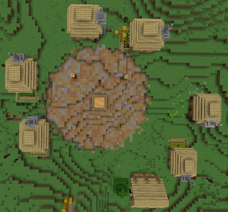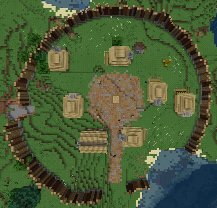 This type of village is slightly rarer than the standard village. It includes slightly more buildings than the standard version, and has a wooden stockade with cobble foundation surrounding the village. It has no gatehouse, but just a gap used as entrance. A short road is leading towads it.