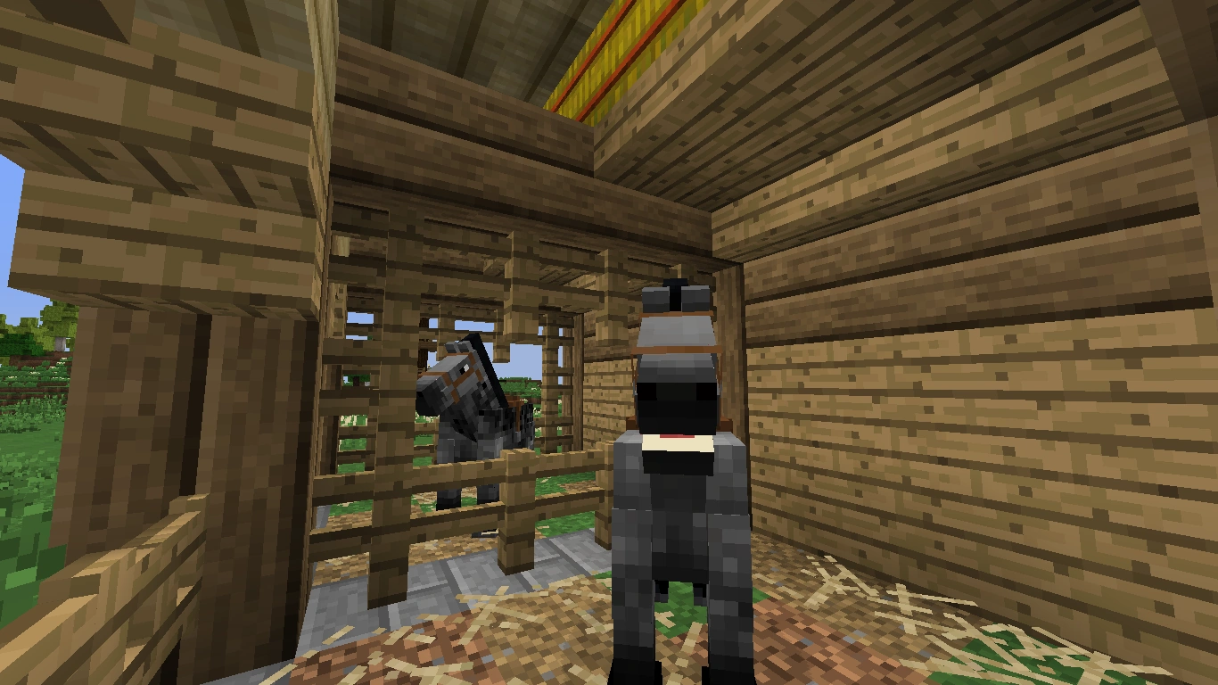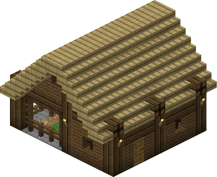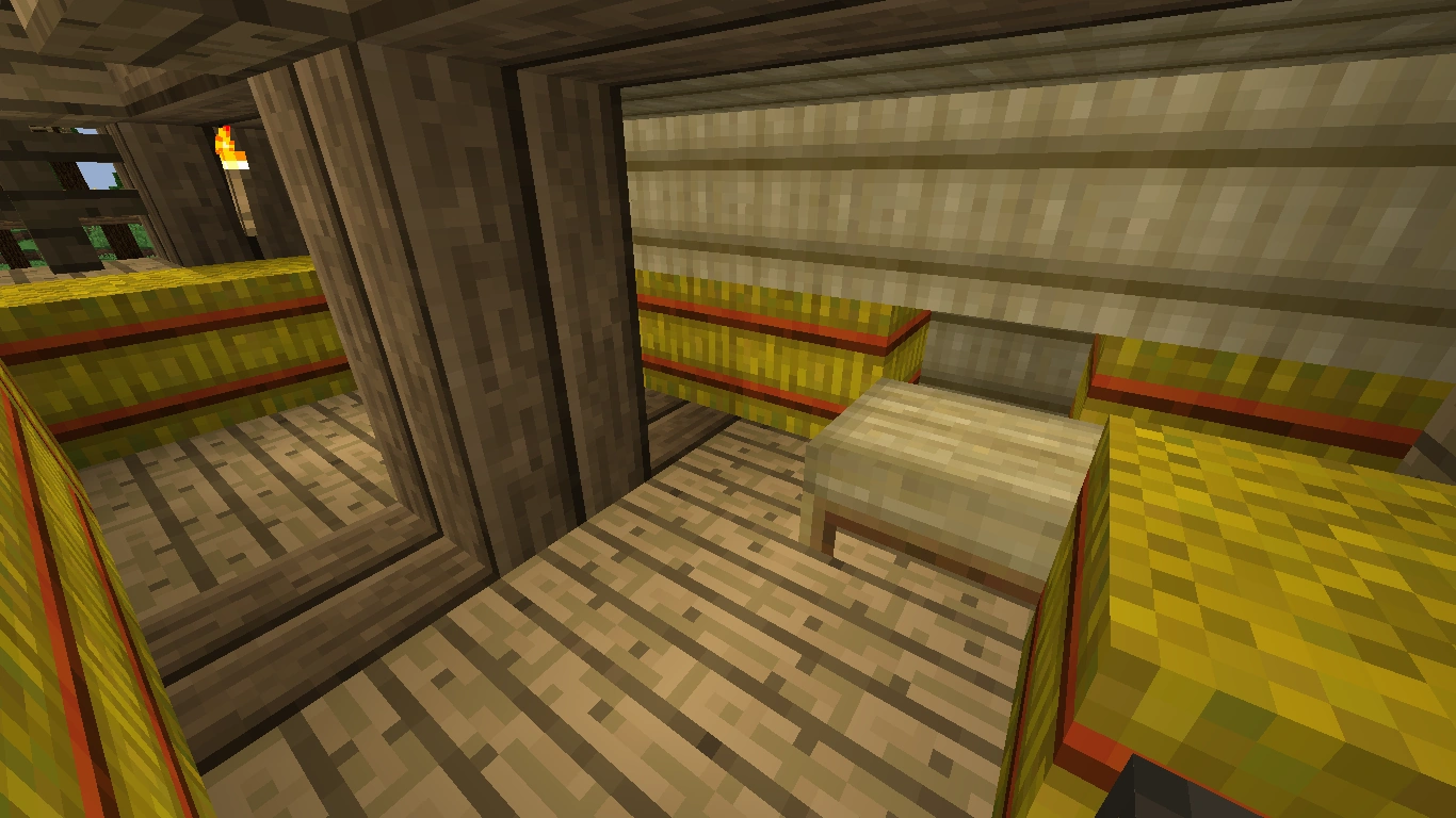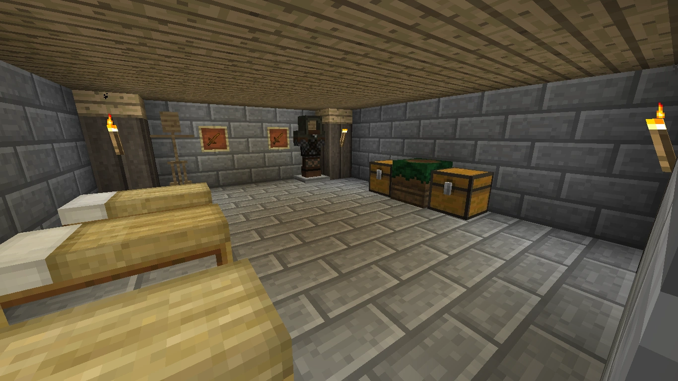 The second half of the building contains two living rooms for the stable hands. The ground floor holds a straw bed, a vanilla crafting table, a table with food and drink, a filled barrel, one chest with common items, and a ladder leading up.