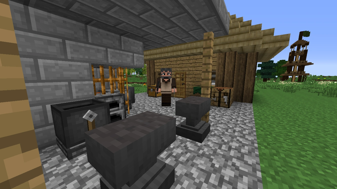 The forge has a lava block inside, protected by bronze bars, a big chimney (don't fall in, if climbing the roof!), a furnace, an alloy forge, an unsmeltery, two anvils, a cauldron, a vanilla crafting table, a Ranger crafting table, and a chest with some loot in it. This is the working place for the blacksmith.
