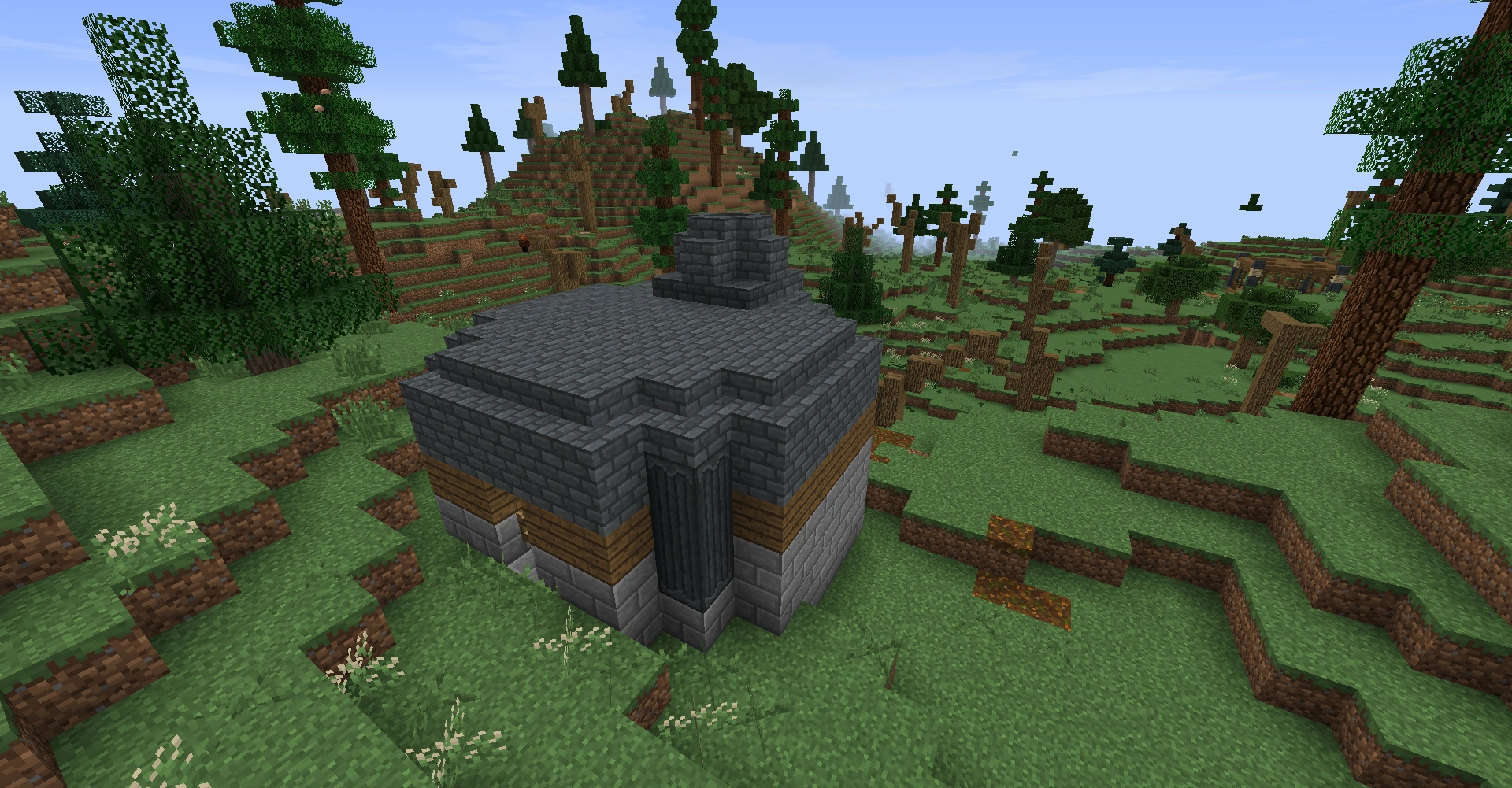 Dwarven Smithies are simple, round, one-room shacks primarily made from Dwarven bricks and stone bricks. The walls feature some wood paneling, which can be spruce, larch, pine, or fir. The entrance to the smithy is only a simple fence-gate, located across from the structure's chimney.