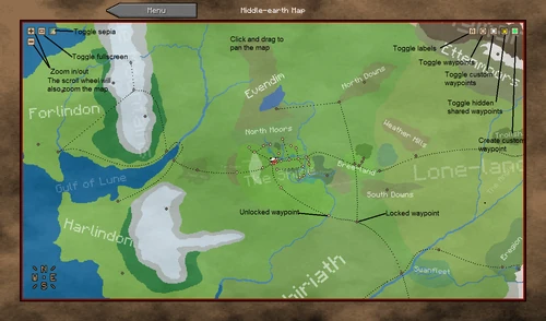 Pressing "L" will take the player straight to the Middle-earth map, which will look something like this: