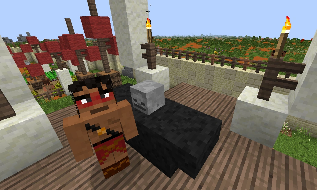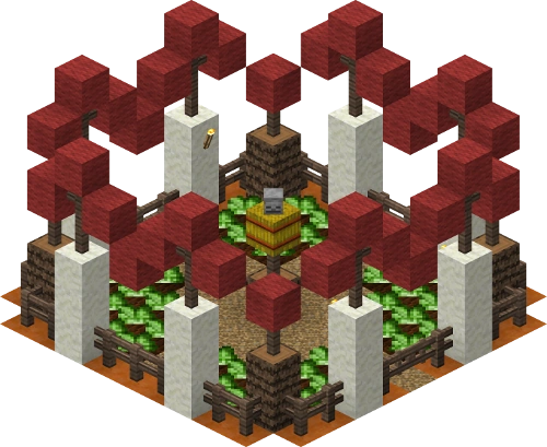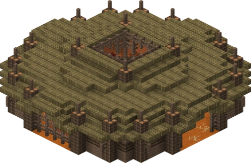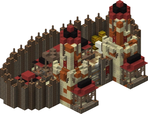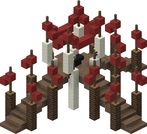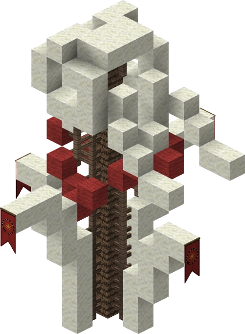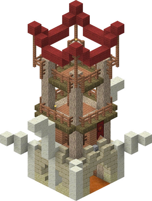 Watchtowers are made of bricks, dragonblood wood, reed and red wool, with spikes made of bone blocks protruding from the walls. The three floors are interconnected by a climbable rope. Only the ground floor contains a reed basket with some loot, a barrel with some alcoholic drink, and a table with a skull, a plate and a drinking vessel. Four each can be found in the corners of towns and fortifications, keeping guard over the settlements.