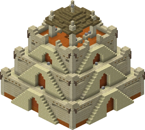 Gulfing ziggurats are impressive-looking terraced buildings, made of Haradric brick and sandstone. One spawns at the heart of each town's central plaza, surrounded by lamp-posts. Ziggurats are very ceremonial in design, with elaborate-looking exteriors that rightfully arouse awe in the viewer. Stairs built on the exterior allow players to climb up to the top of these formidable monuments, where an entrance to the ziggurat can be found. The top level has battlements and a reed roof supported by Haradric pillars, as well as many skulls piled on and around a set of benches.