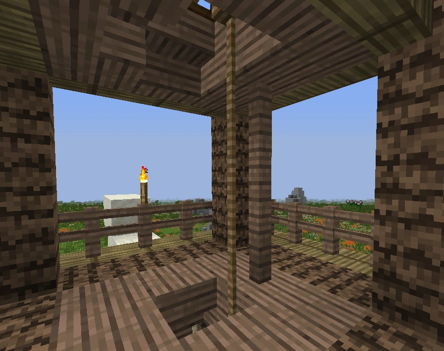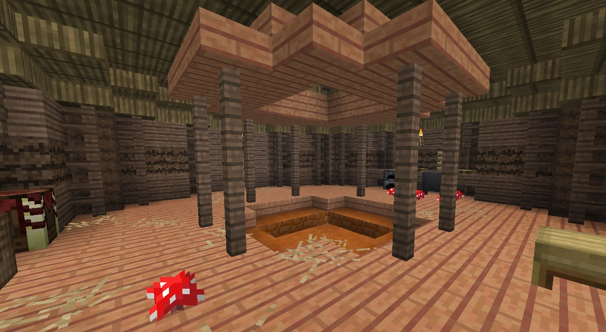 The interiors of these houses are torch-lit and open. The centers of these one-room houses are dominated by the skylights in the roof, which are ringed with poles made out of fences. Beneath the skylight is a pit in the floor, made of red sandstone. The floor will occasionally be strewn with thatch. The far wall of the house features a straw bed, while the left side features tables with drinks, an oven and a filled cauldron, which offer some comfort for the everyday life. A vanilla crafting table, a Gulfen crafting table and a reed basket with some loot can be found on the right side of the house.