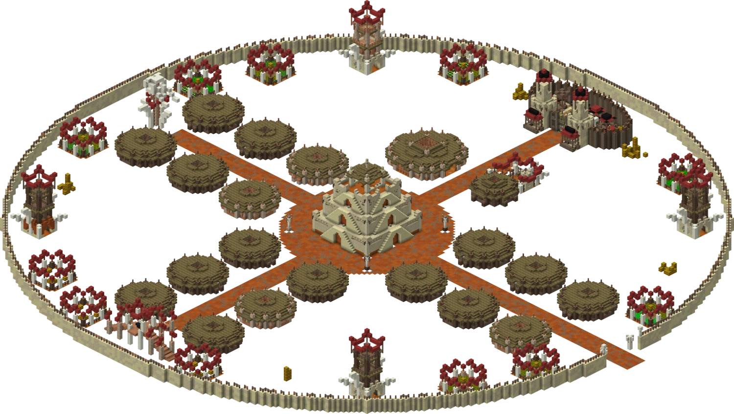 Roads of red sand and red Haradric brick run from the entrance to the town (where a pair of signposts are present) to a central plaza, from which three more roads run out in each of the cardinal directions. Rows of houses line three of these roads, with six houses per road to a total of eighteen houses for the whole town. The fourth road features a tavern, a smithy, and no houses. At the end of each road is one of the town's major structures - the altar, the totem, and the bazaar. In the center of each town there is an impressive ziggurat at the heart of the central plaza, illuminated by lamp-posts.