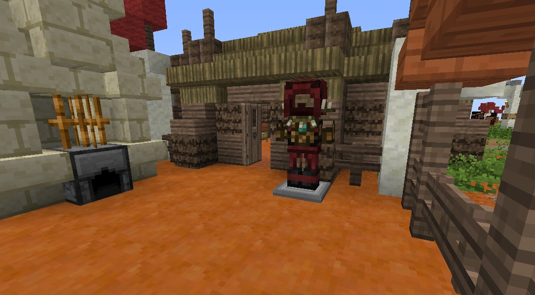 The workyard is paved with red sandstone and holds an alloy forge built into a large Haradric brick structure, Gulfen armour mounted on an armour stand, an anvil, a filled cauldron, a Gulfen crafting table and a second, emptyreed basket. It features its own secondary gate, which can be opened from outside the smithy.