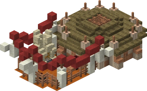 Normally, several farms are found around the perimeter of each type of Gulfing settlement. They are surrounded by palm fences and decorated with red wool and pillars of Mûmak bone, just like Gulfingpastures. In the center of the farm, a scarecrow keeps watch and scares off thieving birds.