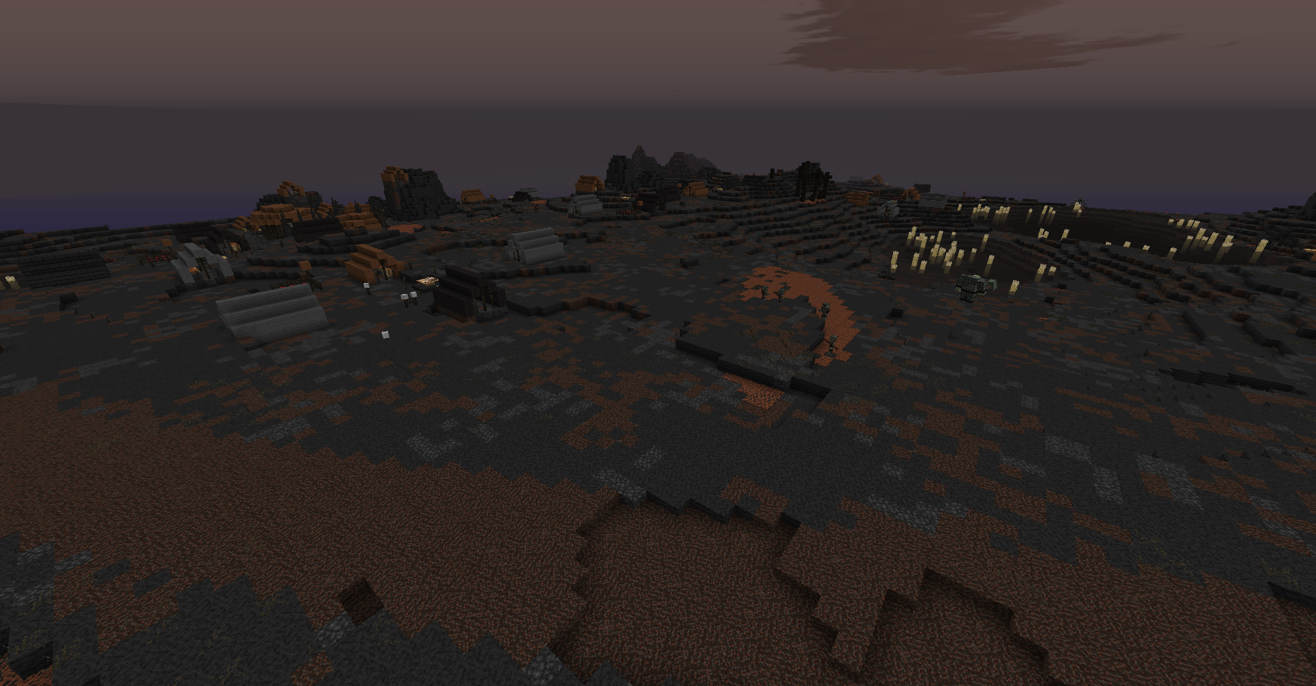 Udûn is a valley in the northwest of Mordor, used by Sauron as a giant mustering ground. The terrain level here is lower than it is in the rest of Mordor, or in most biomes in general, which means that exposed ores, surface lakes, and exposed lava-filled ravines are fairly common here. The ground is fairly flat, though hills are by no means uncommon, and jagged boulders are a frequent sight. The sky here is more of a solemn reddish-grey, a contrast to the rest of Mordor, where the sky is much more red. The valley is full of Orcs, Black Uruks, Wargs, and Olog-hai of all varieties, and almost all the structures that can be found in the regular Mordor biome can be found here very frequently. This is especially true for camps, which practically cover the entire sub-biome.