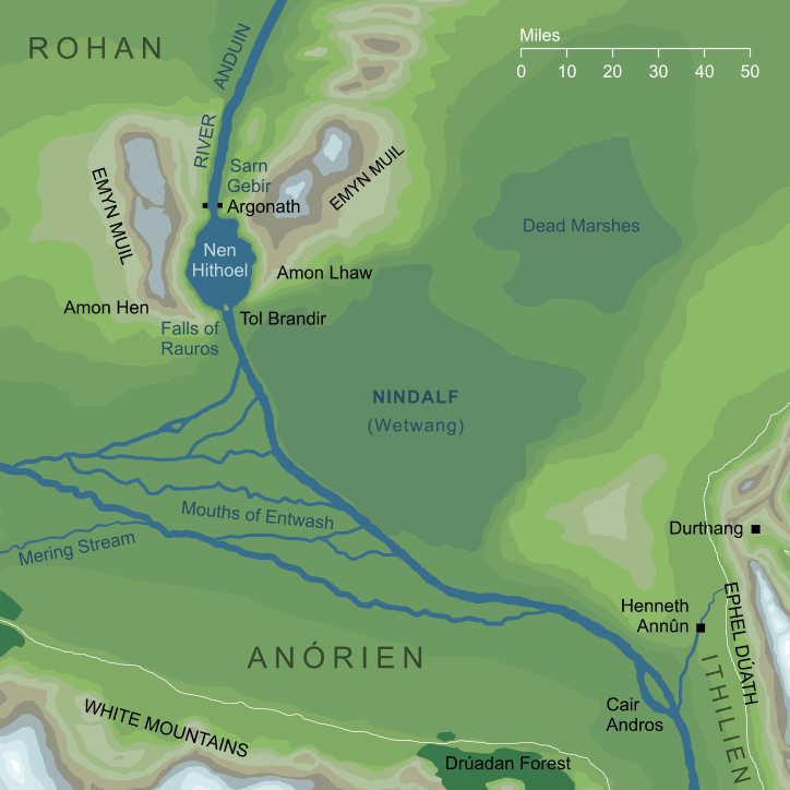 (Anduin) falls […] down into the Nindalf, the Wetwang as it is called in your tongue. That is a wide region of sluggish fen where the stream becomes tortuous and much divided. There the Entwash flows in by many mouths from the Forest of Fangorn in the west.