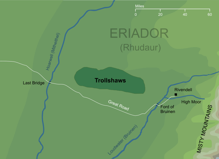 The Trollshaws are one of the Mod's most beautiful biomes, with forests, hills, lakes, and rivers. As such, they can make a nice location for your home, whether you're good or evil, as Rangers are not too abundant and the trolls are gone during the day. In addition, there are plenty of trees for wood, nice high hills offering a commanding view, and plenty of caves beneath the surface. Be aware, however, that no unit hiring captains spawn here; any hiring of units will mean a trip to the Lone-lands or farther. Another challenge of living here is that the region spawns bandits rather frequently, so keep an eye on your surroundings.